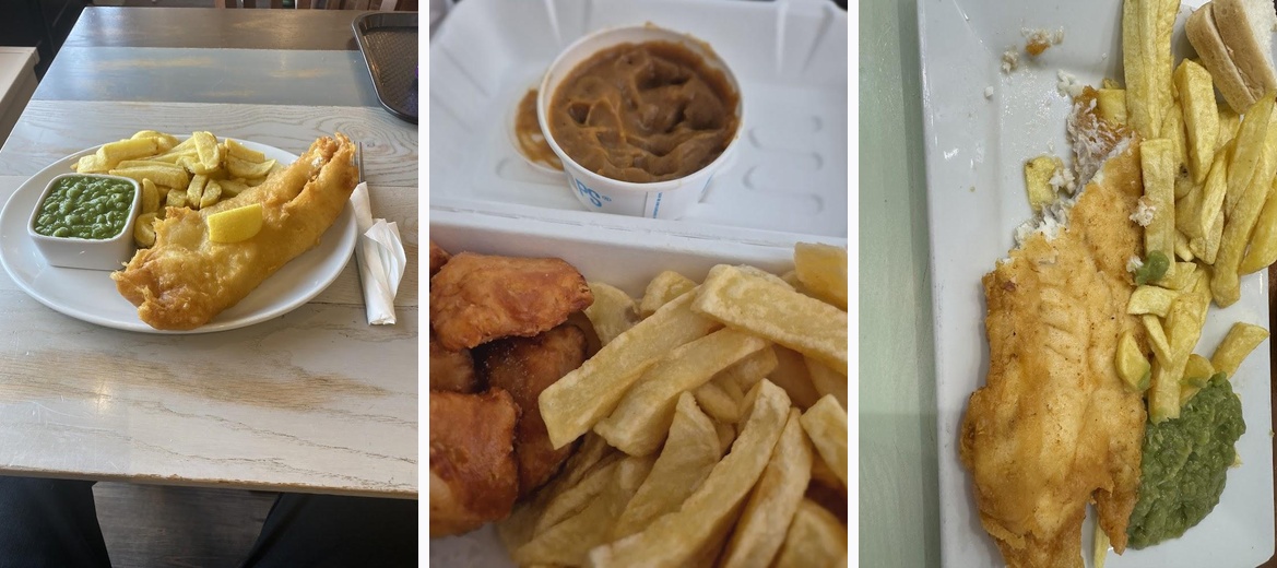 Definitely try the haddock with mushy peas. The fish batter is known for its crispiness. Consider the jumbo sausage if you're looking for something extra.